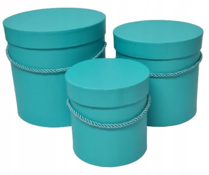 Jeśli szukasz stylowego, efektownego i praktycznego opakowania, ten zestaw trzech okrągłych pudełek w przepięknym turkusowym kolorze będzie idealnym wyborem! Subtelny odcień oraz pleciony uchwyt nadają im elegancji i nowoczesnego wyglądu.