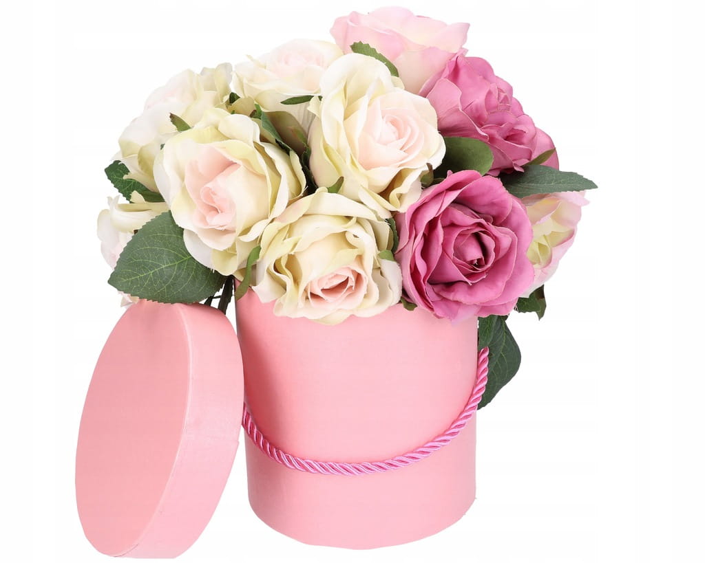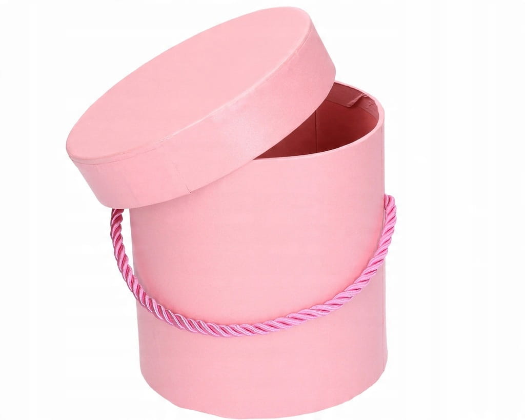 Flowerbox wykonane są z twardej tektury. W kształcie walca, z pokrywką i doczepionym sznurkiem ozdobnym.