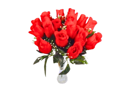 Elegancki bukiet składający się z 18 realistycznych róż w intensywnym czerwonym kolorze. Wykonany z wysokiej jakości materiałów, które doskonale imitują naturalne kwiaty. Dodatkowe dekoracyjne elementy, takie jak liście i drobne białe akcenty, nadają bukietowi wyjątkowego uroku.