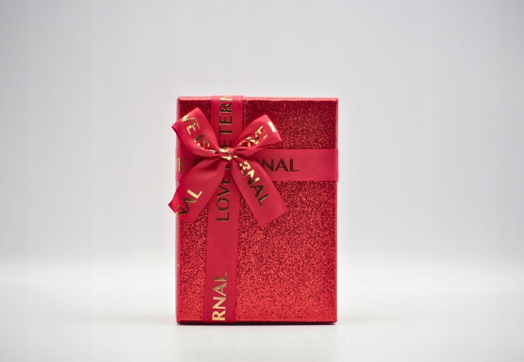 Stylowe i eleganckie pudełko prezentowe w kolorze czerwonym, pokryte błyszczącym brokatem, ozdobione kremową wstążką z napisem "LOVE IS ETERNAL". Idealne na wyjątkowe okazje, takie jak urodziny, rocznice, śluby czy święta.