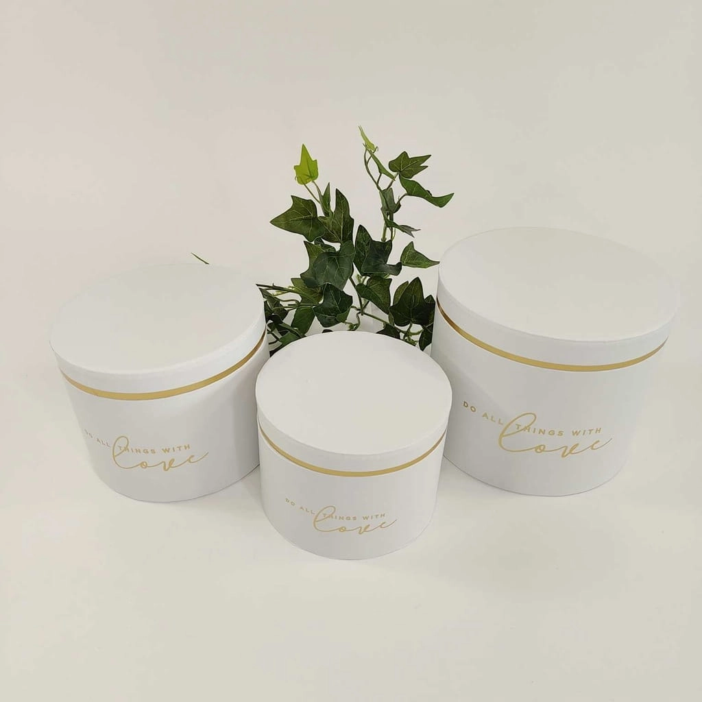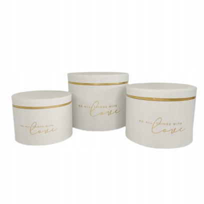 Pudełka wykonane z twardego kartonu, okrągłe w kolorze białym ozdobione złotą tasiemką na boku pokrywy oraz złotym napisem na boku pudełka.