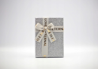 Stylowe i eleganckie pudełko prezentowe w kolorze srebrnym, pokryte błyszczącym brokatem, ozdobione kremową wstążką z napisem "LOVE IS ETERNAL". Idealne na wyjątkowe okazje, takie jak urodziny, rocznice, śluby czy święta.