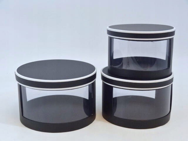 Nowoczesny zestaw trzech okrągłych pudełek prezentowych o eleganckim designie, wyposażonych w przezroczyste ścianki, które umożliwiają subtelne podglądanie zawartości. Pudełka mają różne rozmiary, co czyni je idealnym rozwiązaniem do przechowywania i prezentowania różnorodnych przedmiotów:
