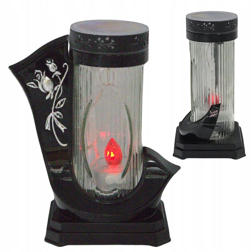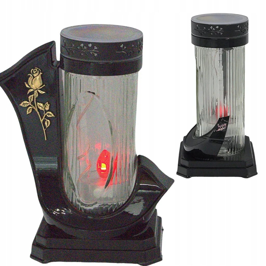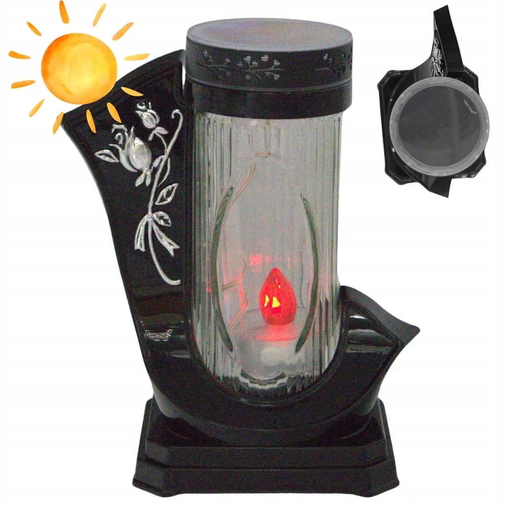 Elegancki znicz solarny o unikalnym kształcie wstęgi, zdobiony złotym motywem. Dzięki nowoczesnej technologii solarnej i grubemu hutniczemu szkłu znakomicie prezentuje się na każdym nagrobku, szczególnie wieczorem i nocą, emitując ciepłe czerwone światło.